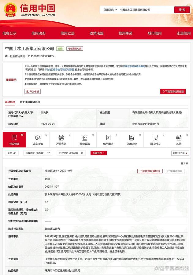 发表时间:2025-11-14 18:27来源:中国基建报 11月12日,本报从信用中国获悉,由于珠海西部中心城区基础设施建设项目首期开发区域A片区Ⅱ-3标段(幸福二路)项目存在多项违规问题,近日,中国土木工程集团有限公司被责令限期消除违规问题,并处以人民币15000元罚款。 本报注意到,据行政处罚决定书文号 斗建罚决字﹝2025﹞9号披露,2025年9月2日,在珠海市斗门区住房和城乡建设局检查组检查时,发现珠海西部中心城区基础设施建设项目首期开发区域A片区Ⅱ-3标段(幸福二路)项目存在以下违规问题: 1.未按要求落实春节后复工程序,未按要求做好复工资料;2.施工现场临时用电违规使用多孔插;3.施工现场工人未按要求佩戴安全帽;4.施工现场工人未按要求组织安全教育交底;5.项目排洪渠旁未按要求设置临边防护;6.施工现场围挡破损未修复,施工现场围蔽防护设置不足,外来人员随意进出;7.电缆沟洞口未按要求设置防护;8.项目现场工人张超进行焊接作业,未配备焊工证,无证作业;9.施工现场工人作业,项目经理、安全员未到岗。 依据《安全生产法》第一百零二条有关规定,珠海市斗门区住房和城乡建设局责令中国土木工程集团有限公司限期消除违规问题,并处以人民币15000元(大写:人民币壹万伍仟元整)罚款。该处罚决定日期为2025-11-07。 本报通过启信宝了解到,中国土木工程集团有限公司注册成立于1979-06-01,注册地址位于北京市海淀区北蜂窝4号,统一社会信用代码为91110000100000817X,法定代表人为刘为民。